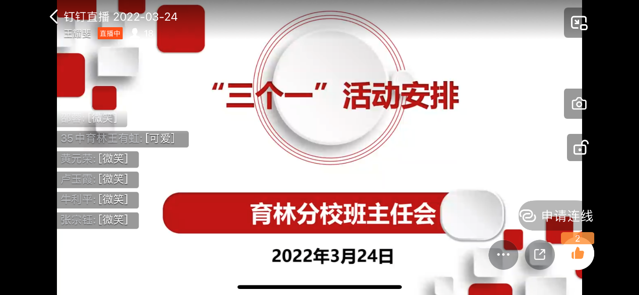 3月24日下午,育林分校召开在线动员会议。会议上,德育主任王耀斐介绍了三个一活动的内容,和我校开展三个一活动的具体部署,安排各班有组织的开展主题班会、建立台账、开展线上家访。同时,对近期的数据上报、学生思想教育、安全管理、心理疏导等方面的工作做出总结和安排。